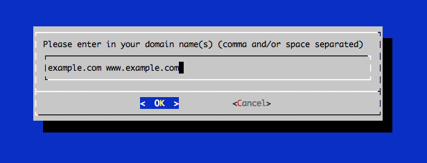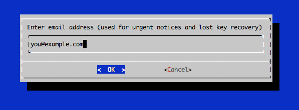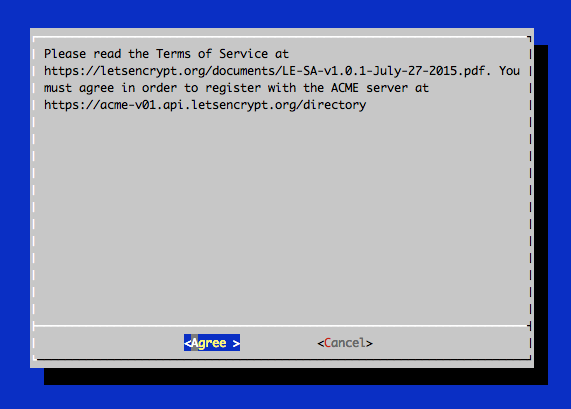 After letsencrypt initializes, you will be prompted for some information. This exact prompts may vary depending on if you've used Let's Encrypt before, but we'll step you through the first time.