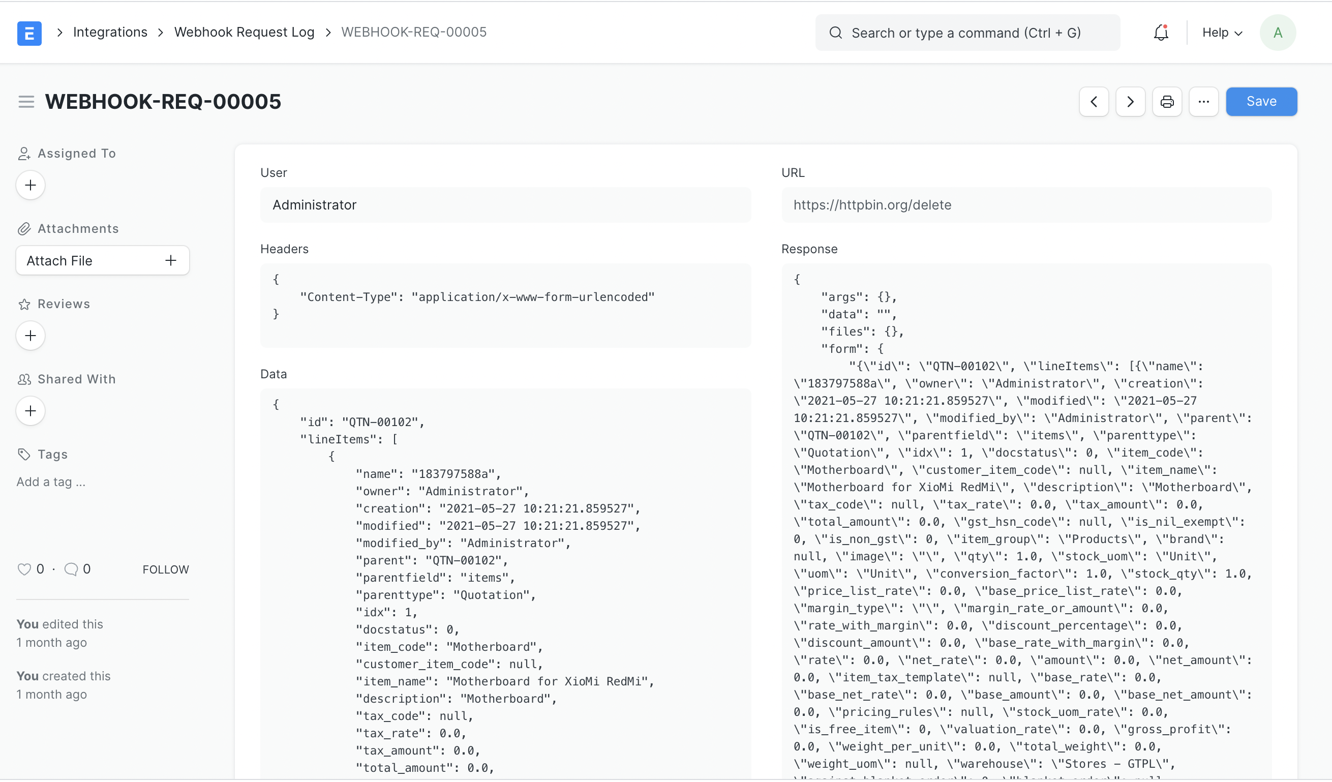The above configuration creates the following JSON request (sent by a DontManage server on Quotation - on_update to https://httpbin.org/post):