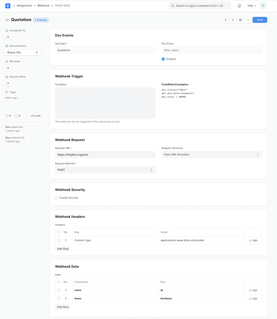 Quotation). - Select the Doc Event that will trigger the Webhook (e.g.