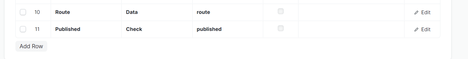 - Add fields named Route and Published in the fields table